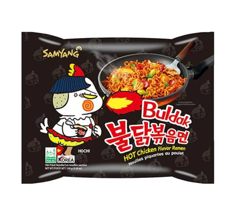 Populære Buldak Hot Chicken Ramen med original spicy smak. Dette er veldig sterke nudler kjent fra fire noodle challenge på YouTube og TikTok. 140 g.