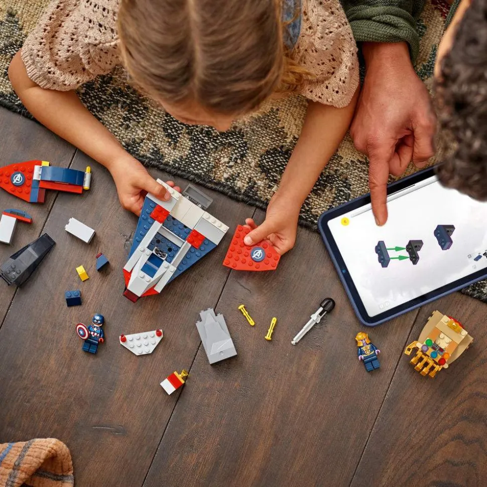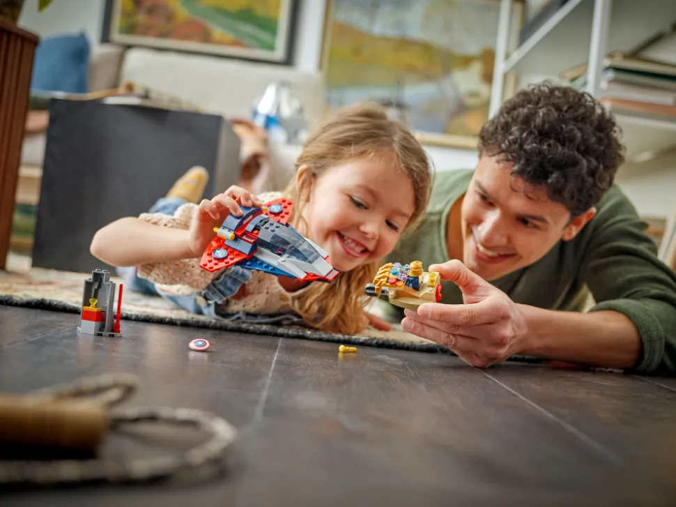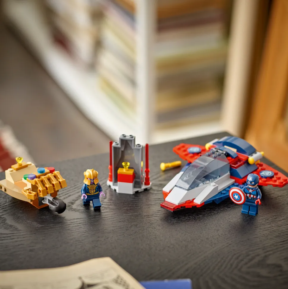 Byggesettet inkluderer to minifigurer: Thanos i et romskip designet som Infinity Gauntlet, med bevegelige «fingre» og en rakettkaster, samt Captain America i en superslank Quinjet med to skytere, en cockpit som kan åpnes og et skjult rom for skjoldet hans. En egen modell inneholder en kosmisk stein som inspirerer til fantasifull lek når Captain America prøver å hindre Thanos i å stjele den dyrebare edelstenen. Hver pose i esken inneholder klosser og en stor startkloss, noe som gjør byggingen enkel og rask, slik at leken kan begynne umiddelbart. Settet leveres med intuitive instruksjoner i et fargerikt hefte. Inneholder 107 deler.