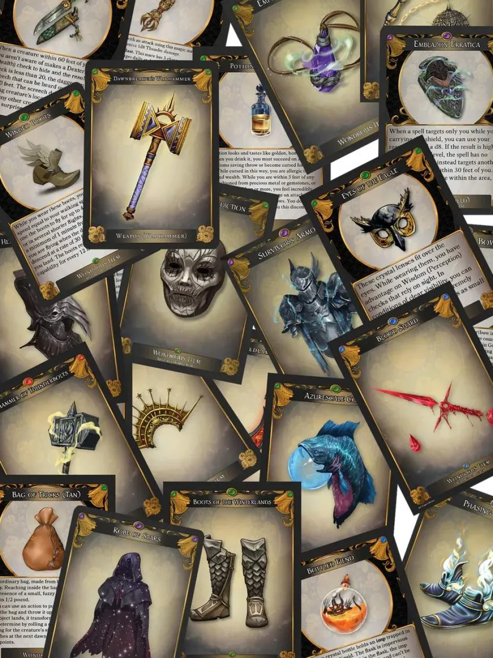 Get a high-quality printed deck containing all 100 new 5E magic items inWanderer’s Guide to Enchanted Emporiums.