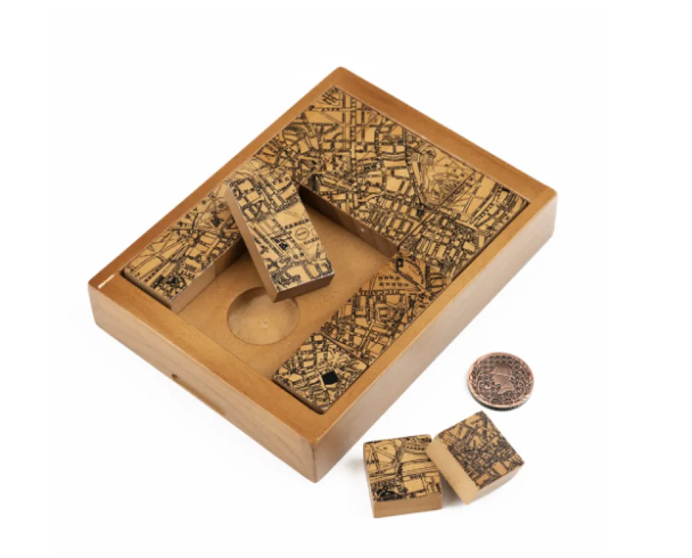 Slide the wooden map pieces to reveal a hidden token that will gain Sherlock entry to his next big case.