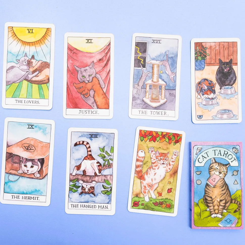 An entertaining and modern twist to the classic deck of tarot cards filled with whimsical and fun cat illustrations and feline humor.