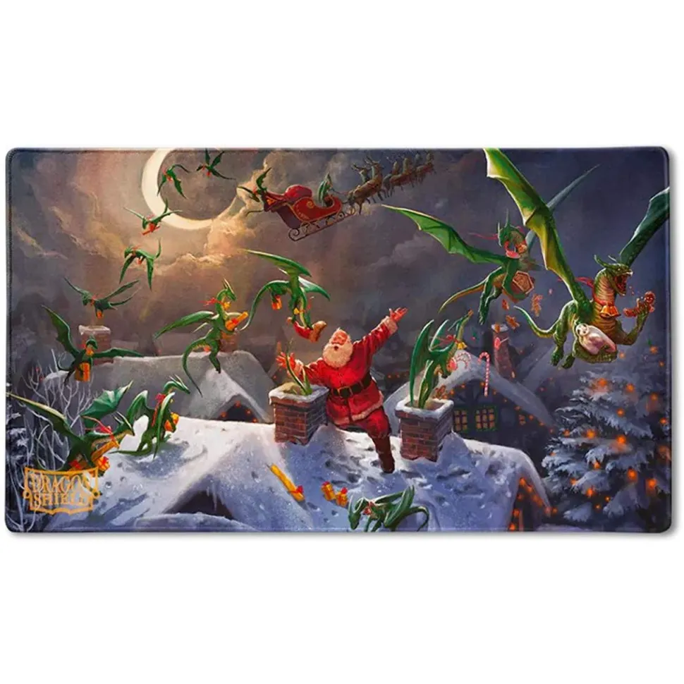It’s not the sound of reindeer on your rooftop this year. It’s Santa’s howls of dispair as his naughty helper dragons swoosh down your chimney and taking off with your baked sweets. Dive into the season’s festive mood with the holiday playmat – featuring a new and improved surface! Enjoy the completely new, silky smooth surface texture. Together with the non-slip, rubber bottom and premium stitched-edge, your playmat will stay in place and see you through countless adventures. Our sturdy art tube provides convenient storage and transport, so you can take your playmat on all your quests. Playmats lay flat straight away without any annoying curls or wrinkles so you are always ready for battle. Measurements: 61×35 cm when laying flat.