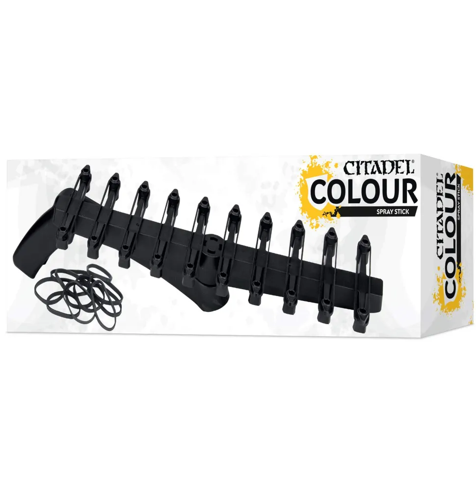 The concept of the Citadel Colour Spray Stick is simple. You use the elastic bands to pin your models in place on the rotating head while you securely hold the pistol-grip handle. The slim, roomy design gives you unfettered access to every nook and cranny of your miniatures, allowing you to spray up to 10 models faster and more thoroughly than ever. The Spray Stick can securely hold bases up to 65mm round.