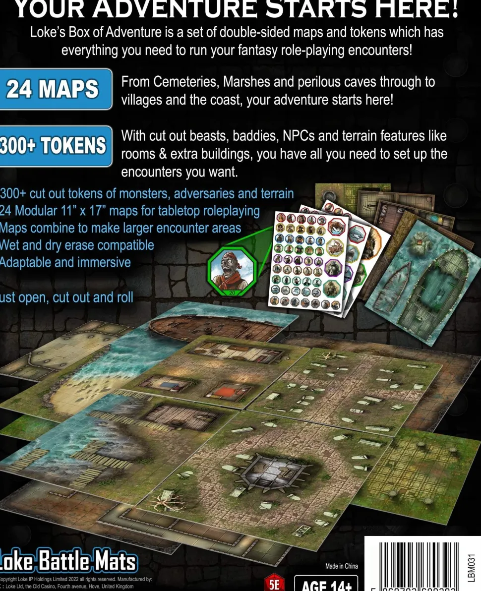 Loke Battle Mats’ Box of Adventure – Coast of Dread – is the system agnostic kit you have been waiting for. It combines modular maps and tokens of monsters, baddies and NPCs, everything you need to run any fantasy RPG. There are also terrain tokens and building tokens. As a result you can customise the maps and build your encounter areas however you want them.
