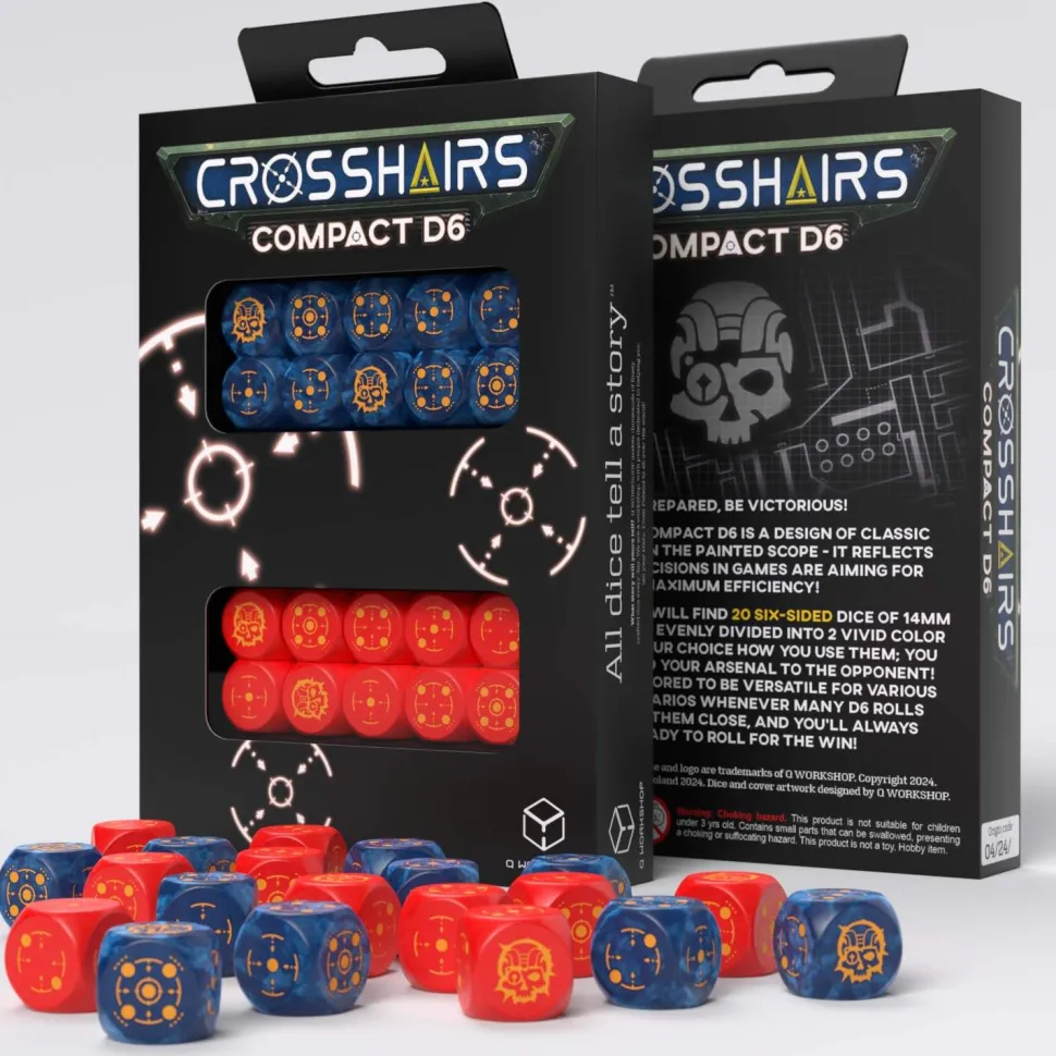 Be always prepared for a game! Here’s something handy: the Crosshairs Compact D6, a pack of 20 dice divided into groups by distinctive background colors: Cobalt & Red! The engravings are orange on all the D6; they also share the size of 14mm, and their design showcases a crosshair symbol with the dots embedded and a cybernetic skull on the highest face. Keep them close for any gaming occasion!