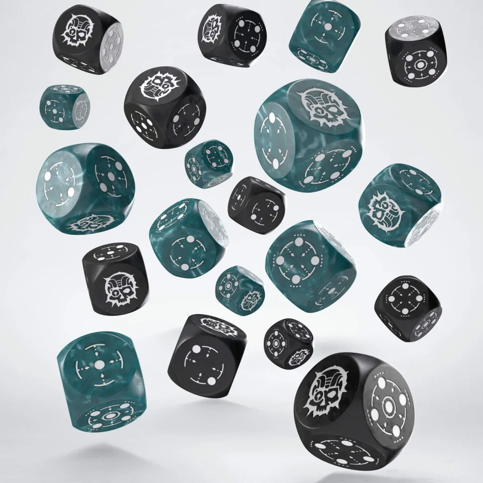 Be always prepared for a game! Here’s something handy: the Crosshairs Compact D6, a pack of 20 dice divided into groups by distinctive background colors: Stormy & Black! The engravings are white on all the D6; they also share the size of 14mm, and their design showcases a crosshair symbol with the dots embedded and a cybernetic skull on the highest face. Keep them close for any gaming occasion!