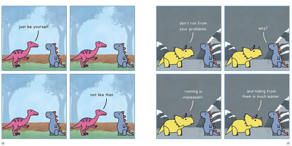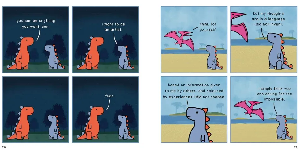 I hver stripe møter du dinosaurfigurer som kjemper med spørsmål rundt meningen med livet og mental helse. De prøver å forstå verden og finne sin egen plass i den, noe som gjør denne boken til en dyp og tankevekkende leseropplevelse. Med humor og innsikt gir «dinosaur therapy» et unikt perspektiv på de utfordringene vi alle møter.