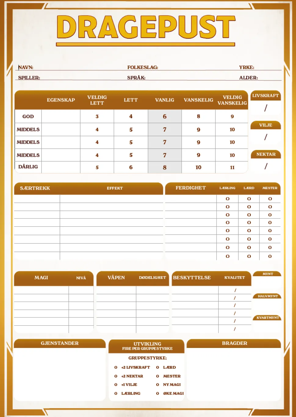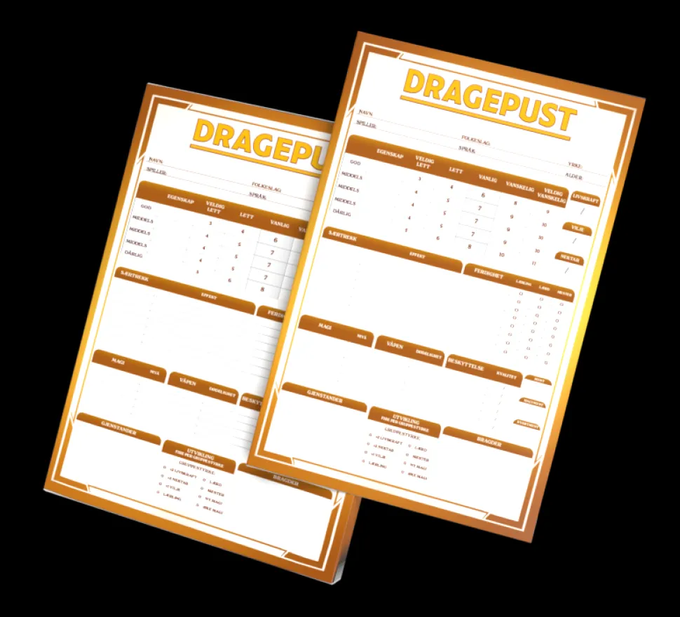 Dette er en blokk med 50 rolleark i farger til Dragepust. Her fører du opp alle de viktige detaljene, slik som egenskaper, ferdigheter og særtrekk og notater om dine bragder, skatter og utstyr til din helt eller heltinne.