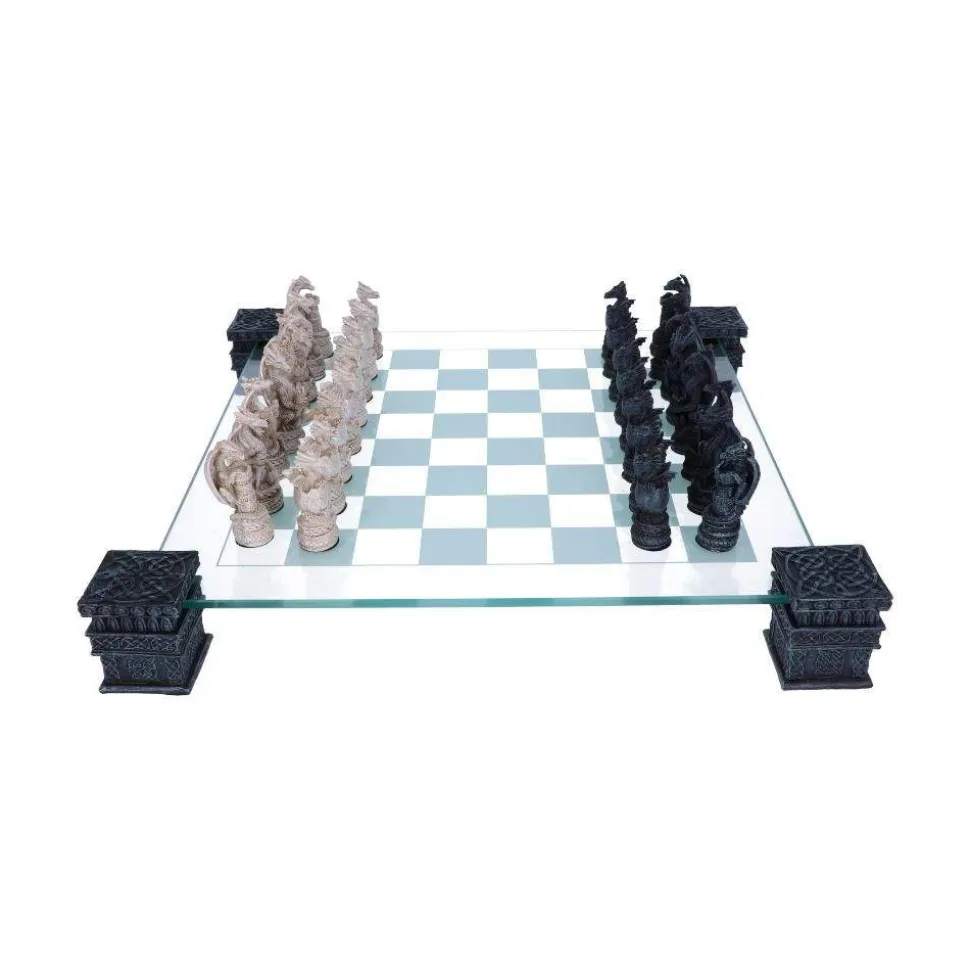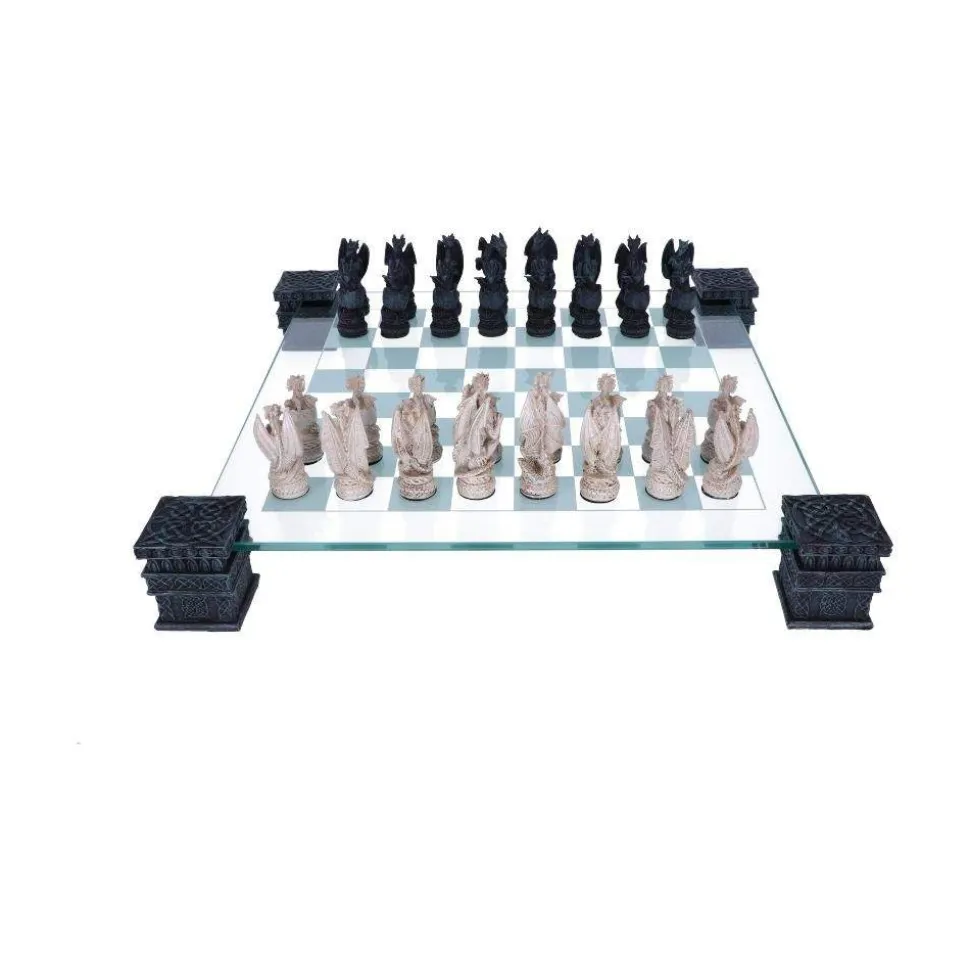 Exercise your brain and challenge your friends with this draconic chess set from alternative brand Nemesis Now’s giftware collection. Held above the table by 4 black towers, each carved with ornate Viking-style knot designs, this glass chessboard has geometric knots and interlinking loops around the edges. On it, two armies of Dragons face each other – one white, one black. Ranging from hatchlings forming a row of pawns to the giant royal Dragons that rule the board, each magnificent piece is cast in high-quality resin and carefully hand-painted. A great gift for a Dragon-loving strategist, this chess set is a great way to challenge your Fantasy-loving friends to a battle of wits and strategy.