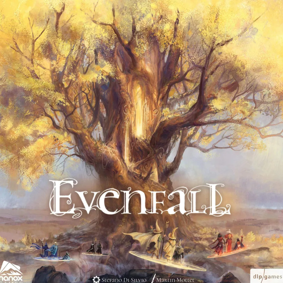 It’s Evenfall, and the Clans of Magic are preparing for a new era. Evenfall is the time when the boundaries of reality collapse and the supernatural awakens. The World-Tree opens its glowing gateways to unknown distant regions. Send Witches from your clan to discover and control new Places of Power. Use them for arcane rituals and battle for the favor of the Powerstones. But there is only one seat on the Enchanted Throne! Do you have the skills to lead the world into a new era?Evenfall is a card-driven, engine-building game with both novel and familiar mechanisms for 1 to 4 players. Manage your resources, execute your actions in an efficient order, and discover card and action synergies that generate victory points. The game ends after three rounds, then the player with the most points wins.—description from the publisher