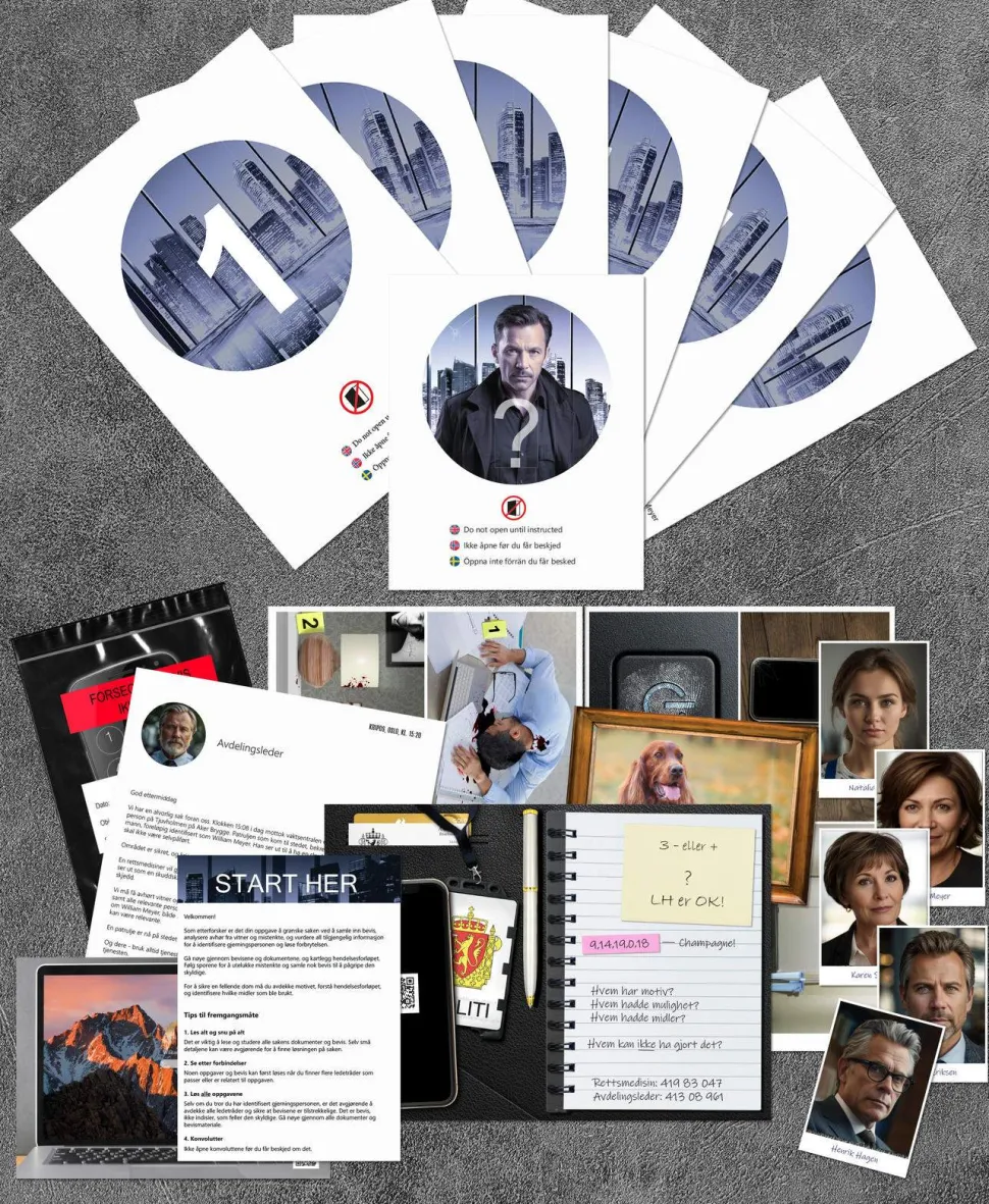 Bli med og løs en av Norges kriminalsaker. Dere mottar saksmappen med alle dokumentene og ledetrådene dere trenger for å løse saken. Sammen skal dere følge sporene, analysere bevisene og samarbeide for å pusle sammen bitene for å til slutt å forhåpentligvis avsløre den skyldige.