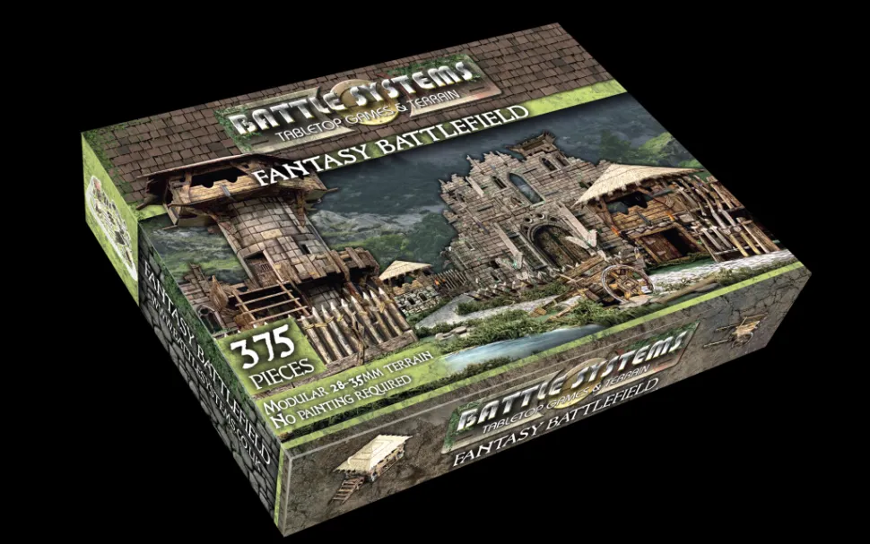 This box contains all the terrain you need for a complete gaming table representing a war-torn battlefield, suitable for many 28-35mm fantasy and historical games. You can tightly pack the terrain into a small skirmish board or spread it out over a larger table. Many of the pieces are modular and can be assembled in any combination you choose for a different set-up every time. The roofs are removable and the buildings have fully detailed interiors.