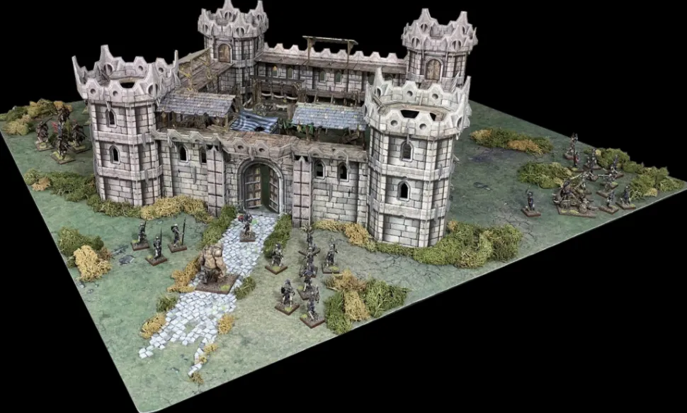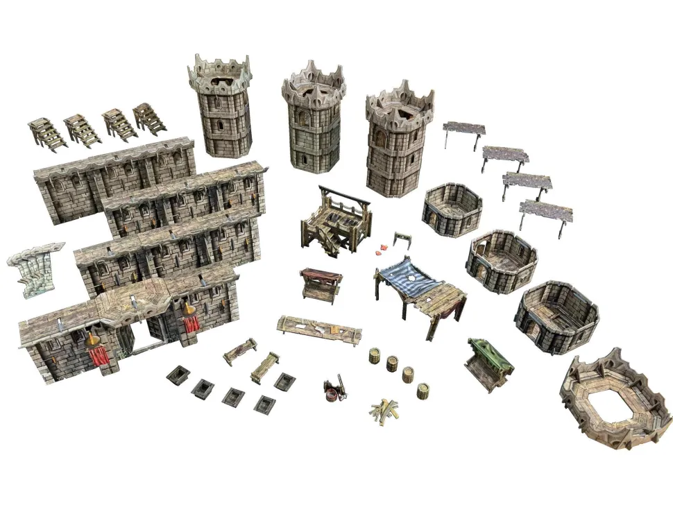 This box contains all the terrain you need for a complete gaming table built in or around a mighty castle, suitable for many 28-35mm fantasy and historical games. You can use the castle walls to surround a small skirmish board or build a longer fortification across a larger table. Many of the pieces are modular and can be assembled in any combination you choose for a different set-up every time. The roofs are removable and the buildings have fully detailed interiors.