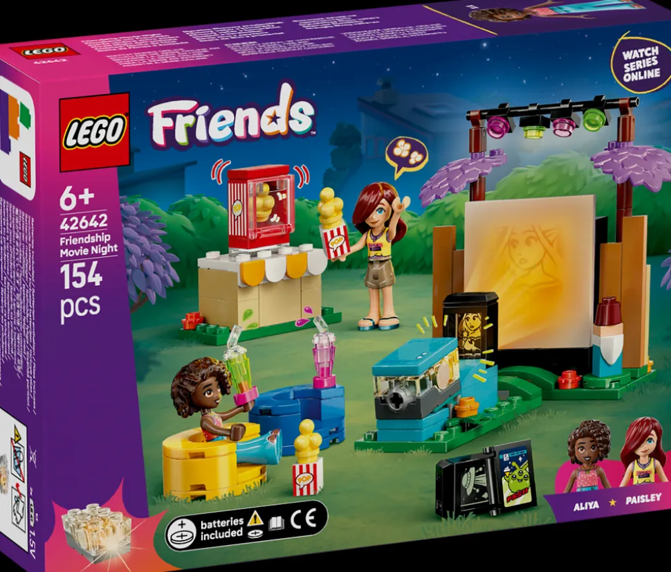 - To LEGO® Friends figurer – denne late som-leken inkluderer minidukker av vennene Paisley og Aliya, som inspirerer barn til å finne på ulike sosiale situasjoner tilknyttet vennenes filmkveld i Paisleys hage