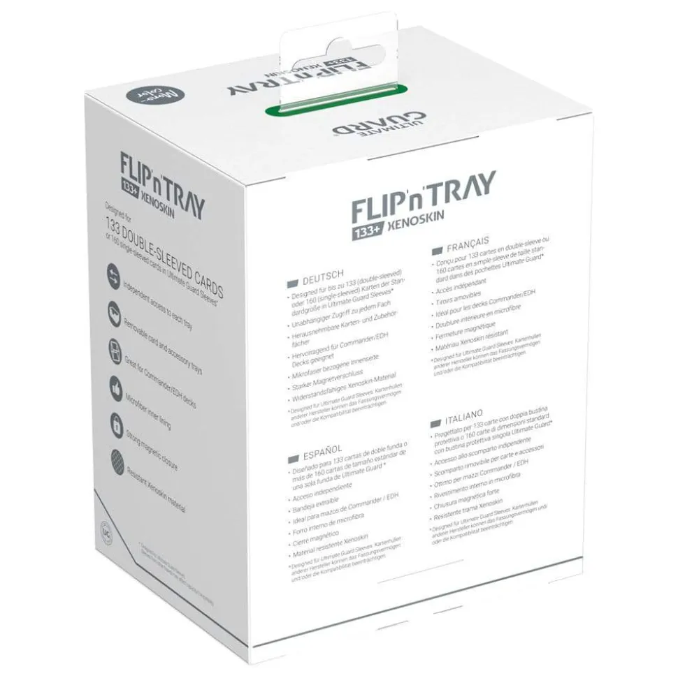 The latest version of Ultimate Guard’s legendary Flip’n’Tray offers even more space: The Flip’n’Tray 133+ Xenoskin fits up to 133 double-sleeved cards, thanks to the integrated extra compartment for dice, the deck box is perfect for Commander/EDH decks and is the optimal companion for Magic: The Gathering players at Limited Events. But fans of other TCGs like Pokémon or Flesh and Blood will also love the spacious and practical deck box with our proven Xenoskin surface!