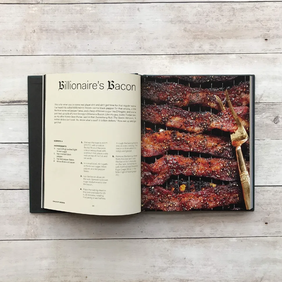 Recipe book that delivers 50 recipes straight from Snoop’s own collection: Snoop’s cookbook features OG soul food cookbook staples like Baked Mac & Cheese and Fried Bologna Sandwiches with Chips, and new takes on classic weeknight faves like Soft Flour Tacos and Easy Orange Chicken. And it don’t stop… Snoop’s giving a taste of the high life with remixes on upper echelon fare such as Lobster Thermidor and Filet Mignon. But we gotta keep it G with those favorite munchies too, ya know? From chewy Starbursts to those glorious Frito BBQ Twists, you should have an arsenal of snacks that’ll satisfy. And of course, no party is complete without that Gin and Juice and other platinum ways to entertain.