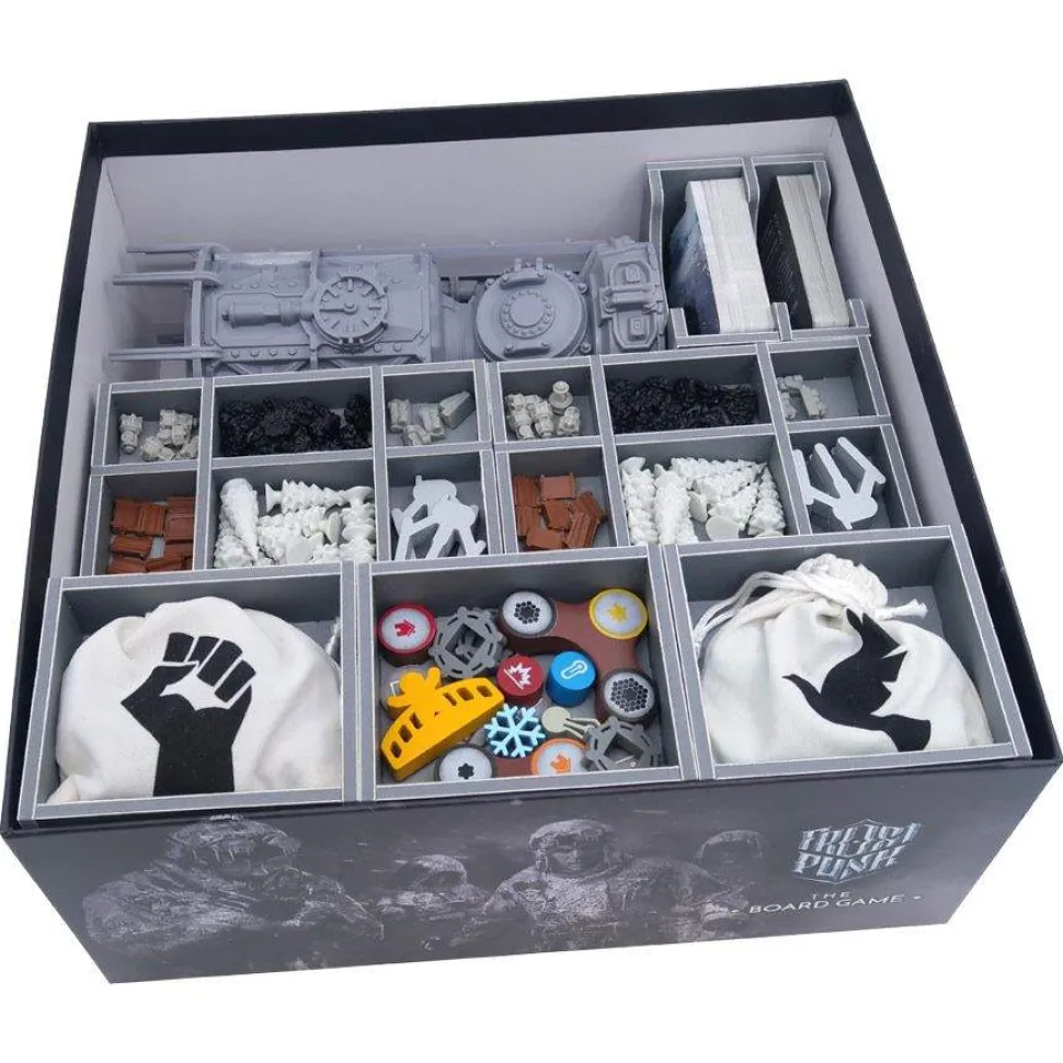 Insert compatible with Frostpunk® , including the Frostlander® expansion. The design provides both efficient storage and improved game play. Many of the trays can be utilised during the game, and they greatly aid set-up and clear-away times. The boards and rulebooks act as a lid on top of the trays.