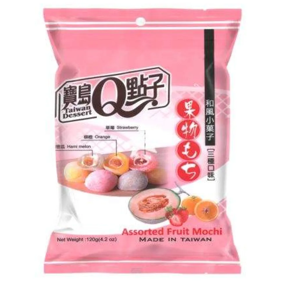 Mochi er en tradisjonell søt japansk dessert basert på ris, som passer spesielt godt å servere sammen med te. Mochi finnes i mange forskjellige smaker, i denne pakken får du en blanding av smakene melon, appelsin og jordbær. Det garanteres ikke at pakken inneholder alle smaker, da den er pakket vilkårlig.