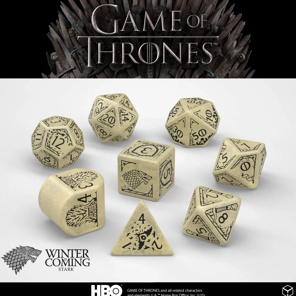 This officially licensed dice set reflects the iconic colors of House Stark, thus mirroring its banner with beige dice and deep black engravings. The design calls for things familiar, from their home in Winterfell to the direwolf sigil, Jon Snow’s sword, and the Starks’ motto. All are carefully crafted for clarity and impact, a premium-quality prop, ideal for Game of Thrones fans.