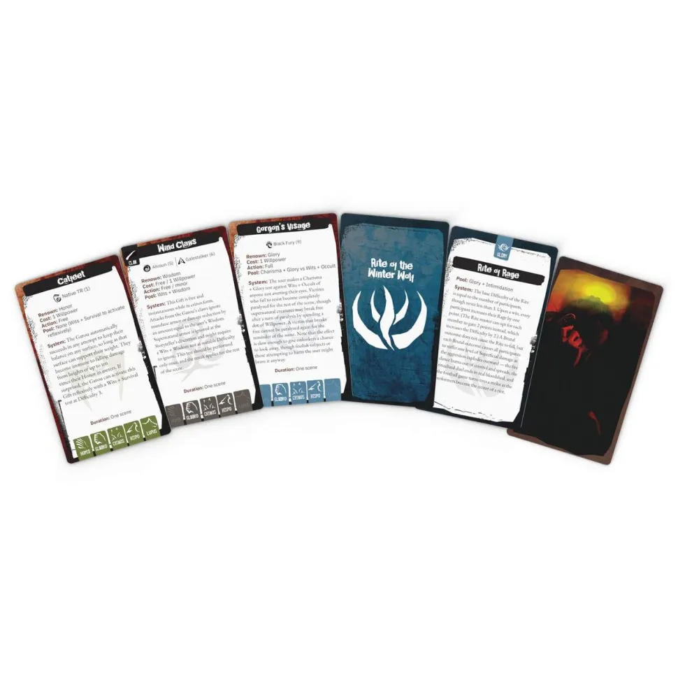 The spirits grant potent Gifts the Garou placate the spirits with powerful Rites. Both sides may be unwilling allies in the struggle to survive the Apocalypse and combat the Wyrm. ThisGift and Rite Deckcontains each of the Gifts and Rites found in the core rules forWerewolf: The Apocalypseplus theStoryteller’s ToolkitandShattered Nation. Each Gift and Rite is presented on a standard Tarot-sized card for ease of use at the table.