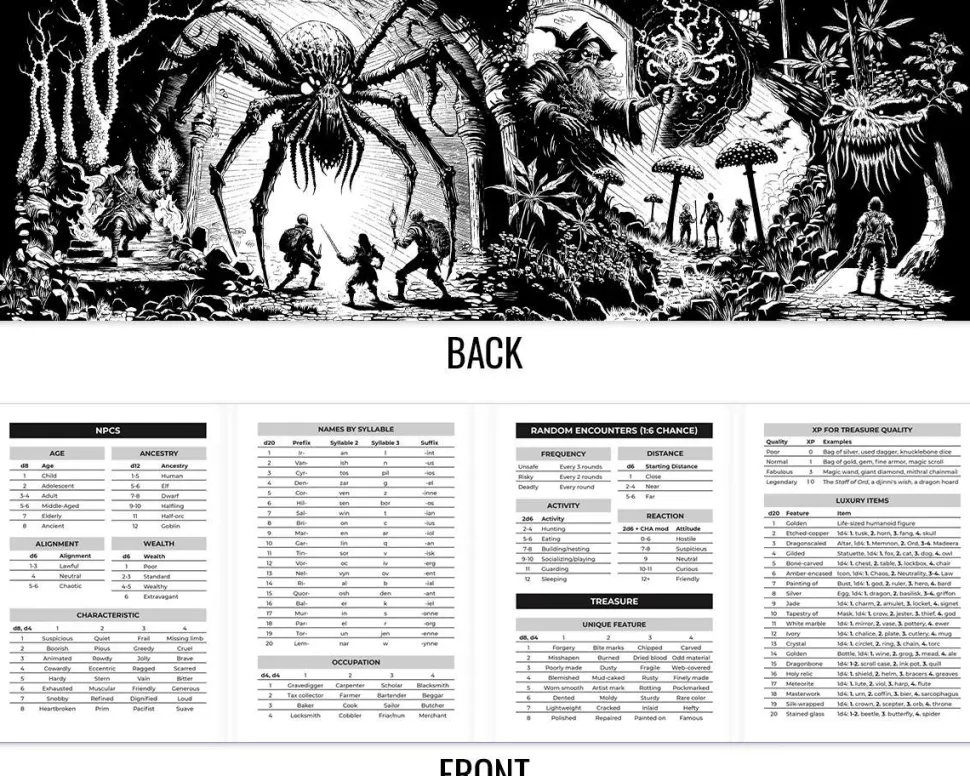 The tables inside the GM screen are not merely duplicates of the quick-reference material already printed on the inside covers of theShadowdark RPGbook.The screen expands those tables with random encounter details, names, NPC qualities, and a treasure generator!