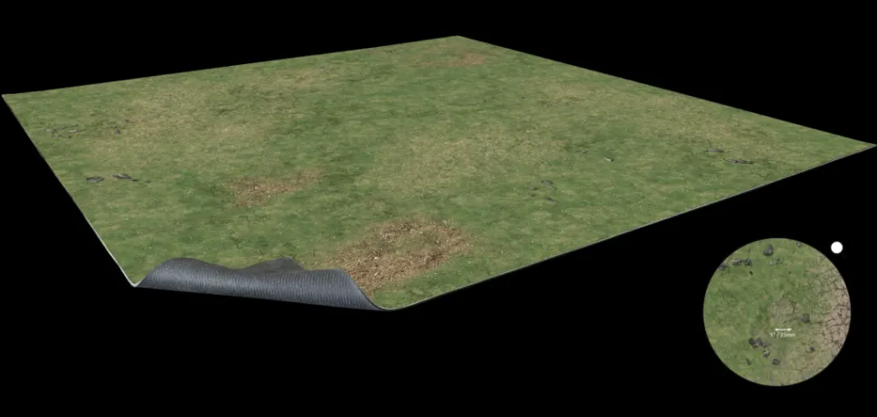 This gaming mat depicts an open green field. It is printed in high quality on fabric with a 1mm neoprene backing. It can be combined with similar mats to make a larger battlefield and can be rolled or folded for easy storage.