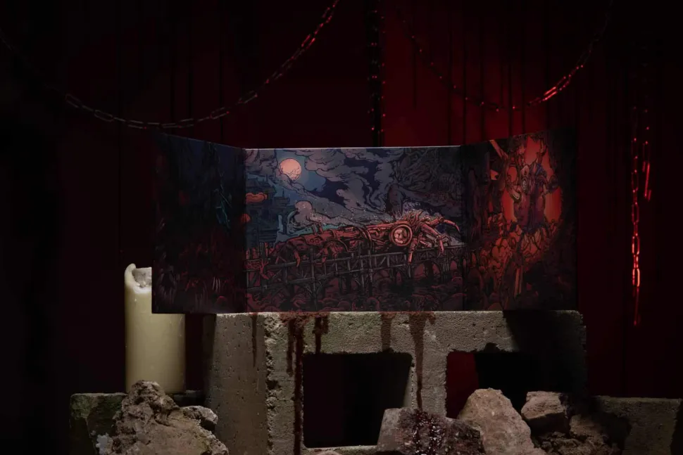 The Heart GM Screen is a gorgeous three-panel landscape screen. The player facing side depicts the sprawling vista of the Below, where the Delving Machine featured in Dagger in the Heart cuts through reality to reach the centre of the Heart.