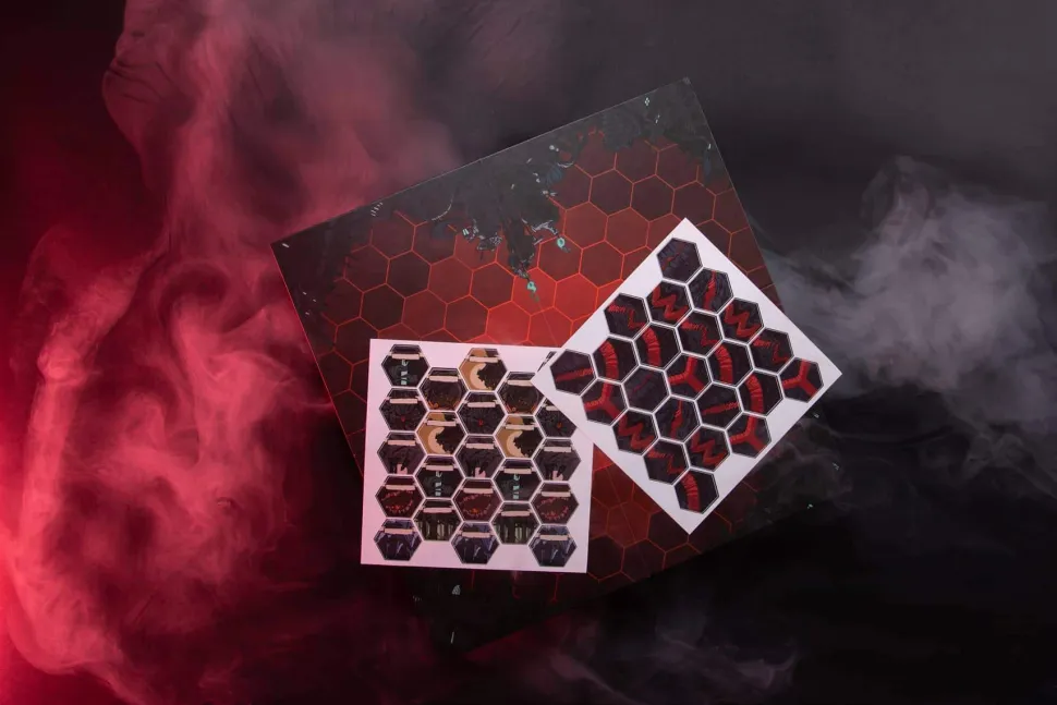 The map is printed on thick cardboard (akin to a board game) and is 45cm square when unfolded. Each is supplied with two sheets of hex-shaped stickers – a mix of landmarks (each themed after one of the game’s Domains) with a blank space to write a name, and connections to stitch them together.