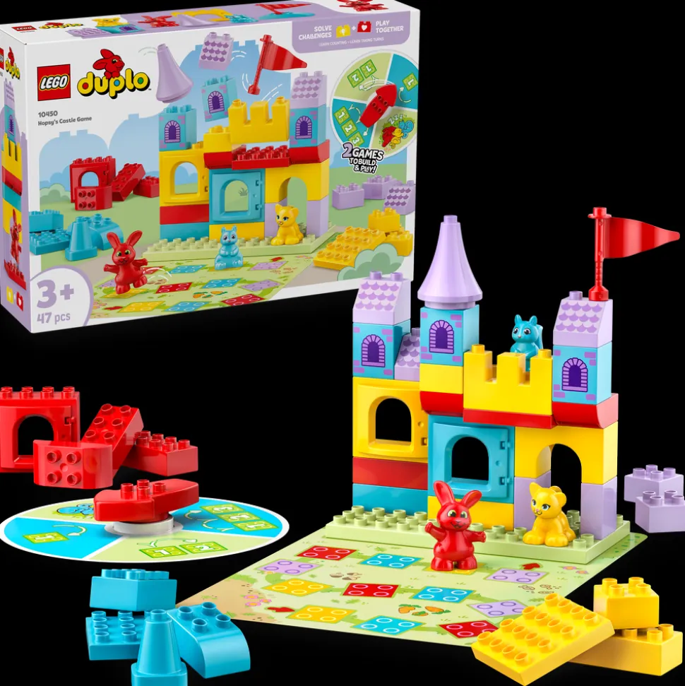 - Lekesett for læring gjennom lek – bli med på gøyale familieaktiviteter med 2-i-1-brettspillet LEGO® DUPLO® Hopsys slottsspill for førskolebarn