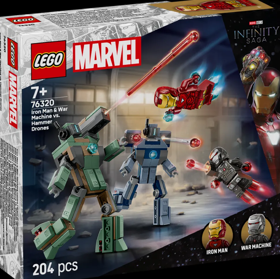 Denne byggbare leken gjenskaper den episke kampscenen fra Marvel Studios’ Iron Man 2. Settet inkluderer minifigurer av Iron Man og War Machine samt to byggbare Hammer-droner. Hammer-dronene er fullt leddet, slik at barn kan posere dem for realistisk og dynamisk lek. Den grønne Hammer-dronen er utstyrt med en skuldermontert fjærbelastet skyter, mens den blå Hammer-dronen har en skyveskyter på hver skulder. War Machine har røde hånd- og fotblastere samt en skuldermontert knotteskyter. Iron Man er utstyrt med blå hånd- og fotblastere og kan holde laserstråleelementer. For ekstra digital moro kan byggere zoome inn, rotere modellene i 3D og følge byggeprosessen i den intuitive LEGO Builder appen.