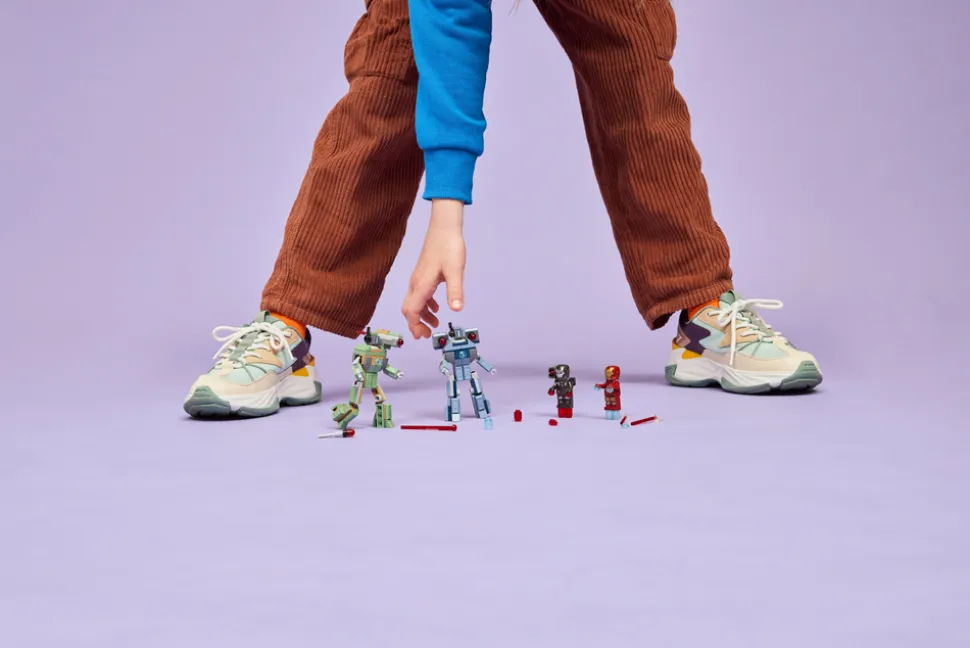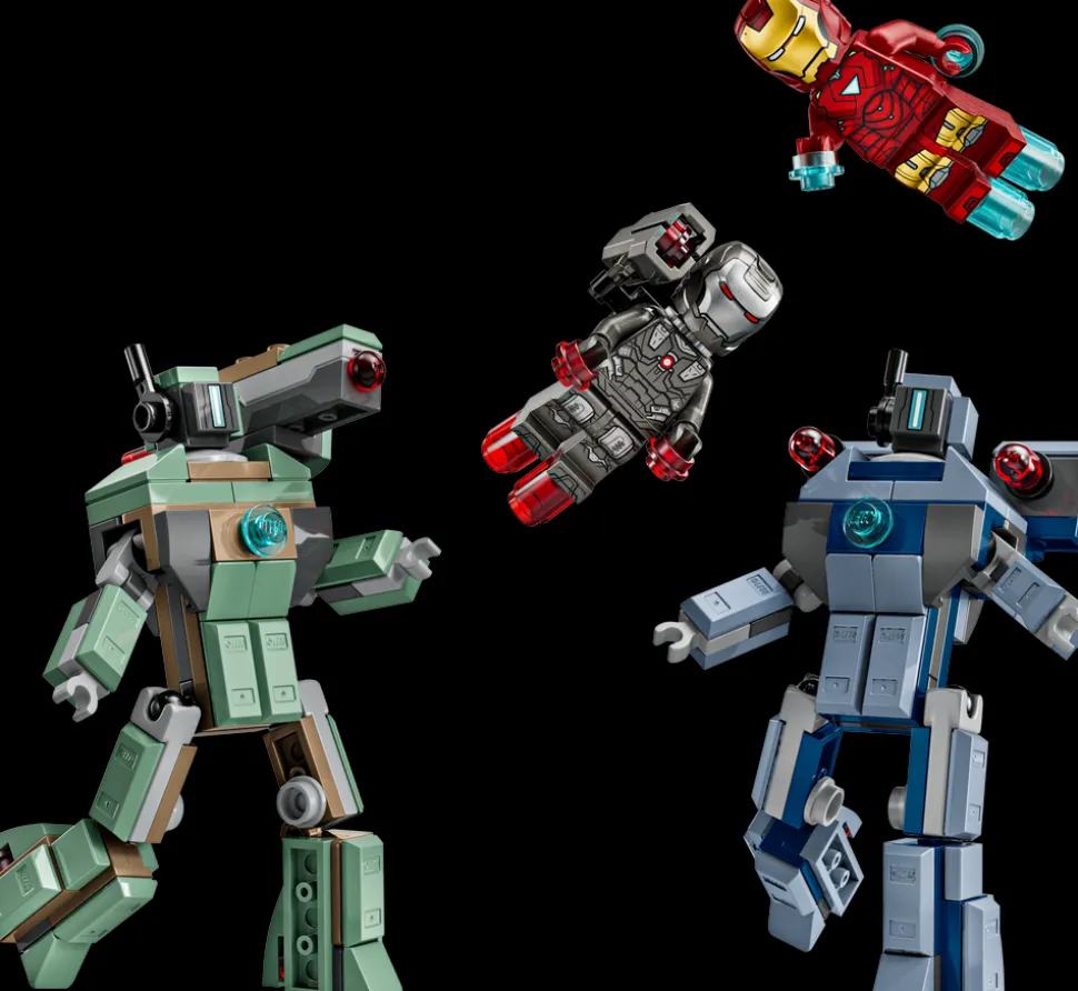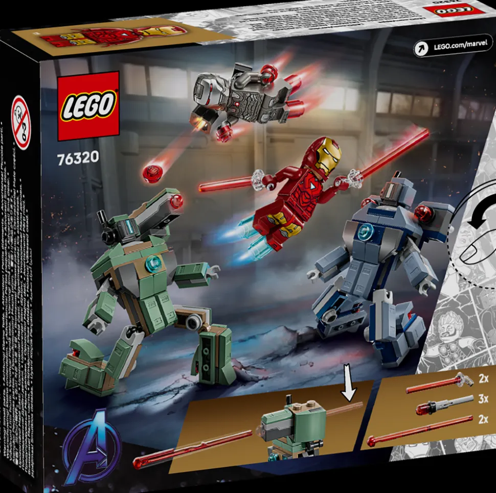 - LEGO® ǀ Marvel minifigurer – inkluderer en Iron Man-minifigur med blå hånd- og fotblastere samt et laserstrålevåpen, og en War Machine-minifigur med røde hånd- og fotblastere og en skuldermontert knotteskyter