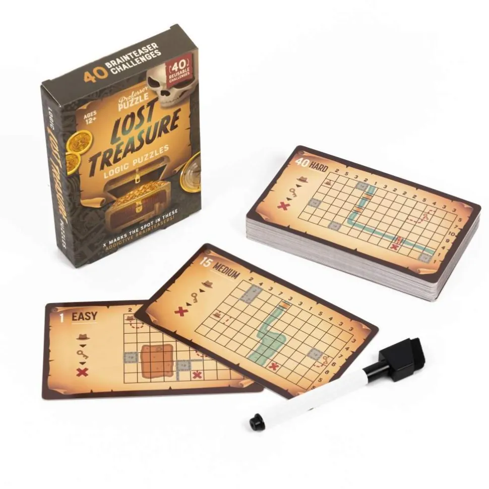 Within the 3.5″ wide and 5″ tall box, there are 40 reusable challenges that are easy, medium and hard levels; dry-wipe pen and instructions. Use the number clues to work out the trail to the treasure.