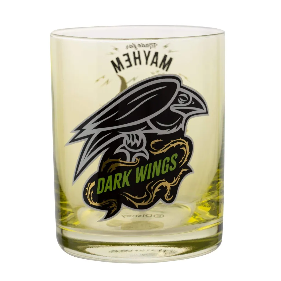 The green glass showcases a shiny finish, complete with printed image of the Maleficent and ‘Made for Mayhem’ title. On the opposite side sits a complementary image of Diaval the Raven alongside ‘Dark Wings’ wording.