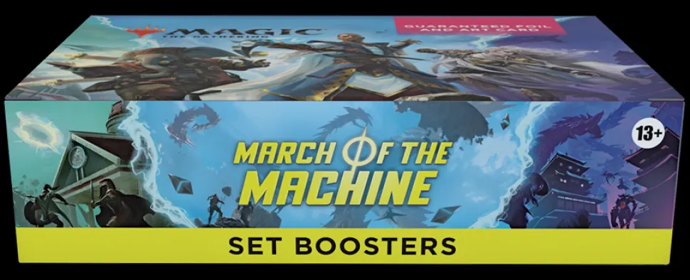 The March of the Machine Set Booster Box contains 30 March of the Machine Set Boosters. Each Set Booster contains 12 Magic cards, 1 Art Card, and 1 token/ad card, Helper card, or card from “The List” (a special card from Magic’s history—found in 25% of packs).