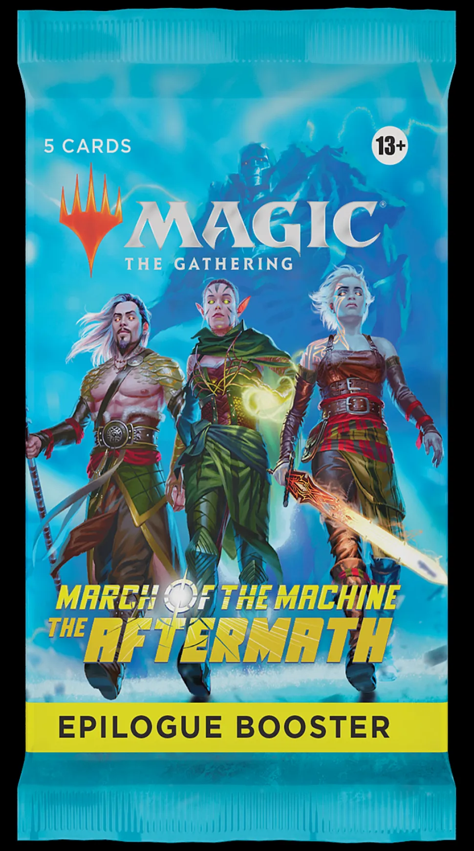 Every March of the Machine: The Aftermath Epilogue Booster contains 5 cards, with a combination of 1–3 card(s) of rarity Rare or higher and 2–4 Uncommon cards. In every pack, a total of 1–2 card(s) of any rarity are Traditional Foil.