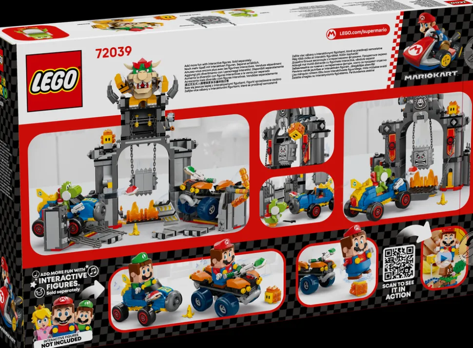 - LEGO® Super Mario™ racerbanesett – du kan avfyre skjell fra Standard ATV og Mach 8-karten, kjøre rundt slottet (eller gjennom slottsmurene som kan foldes ut), styre unna den snurrende Fire Bar-stangen og mer