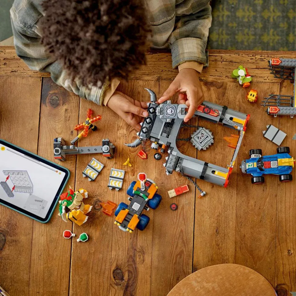 - Bowsers slott – arranger løp mellom Bowser og Yoshi, kjør tvers gjennom murer og unngå en styrtende Thwomp med dette LEGO® Super Mario™: Mario Kart™ lekekjøretøysettet for barn