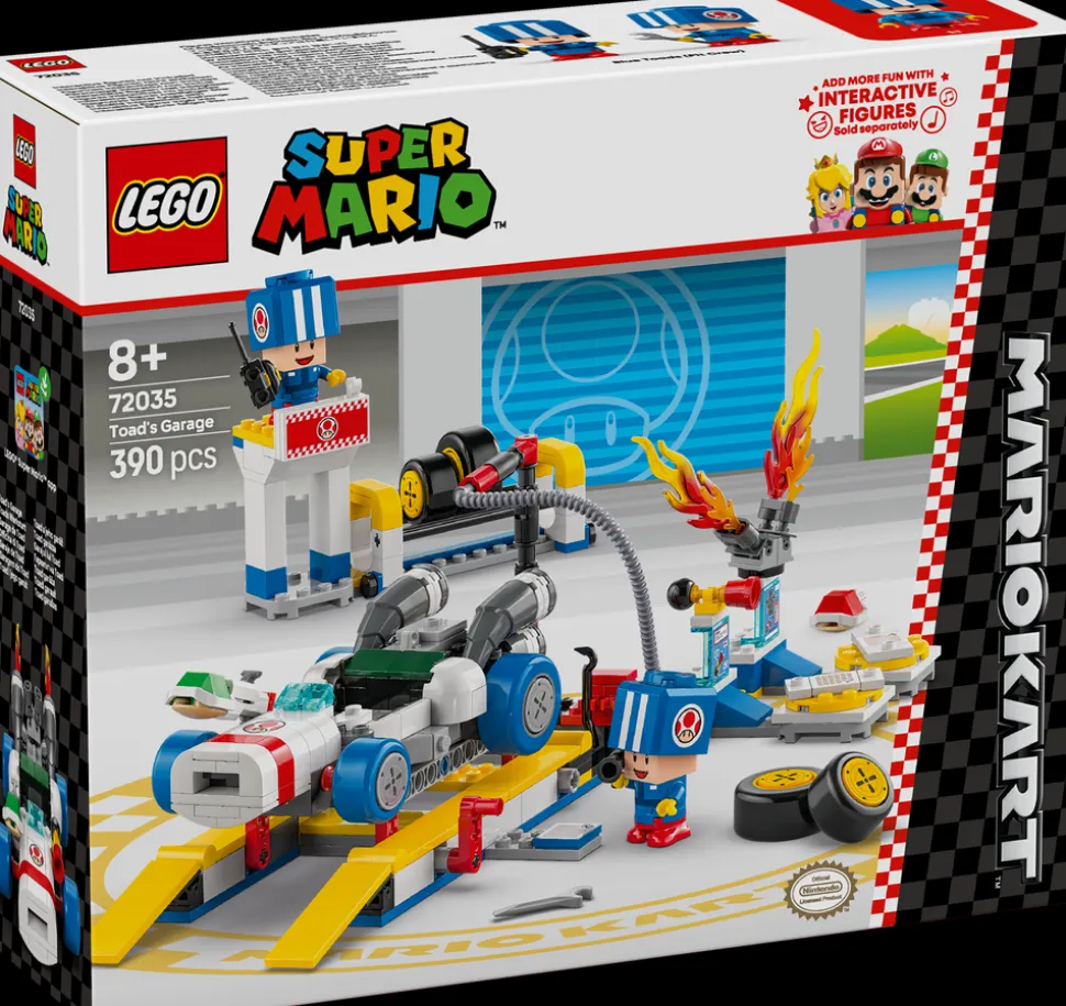 Barn kan rolleleke at de er med i depotteamet på Toads verksted, hvor de klargjør en B Dasher for actionfylt racing med dette LEGO® Super Mario™: Mario Kart™ lekesettet (72035). Settet er en fantastisk Nintendo®-gaveidé med figurer for jenter, gutter og gamere fra åtte år. Inkluderer to Blue Toad-lekefigurer i blå depotteam-drakt, fungerende bilheis, Standard Tires eller Blue Standard Tires og verktøy. B Dasher er utstyrt med en skjellskyter, og barn kan montere et horn og en motor fra tilpasningsmaskinene.