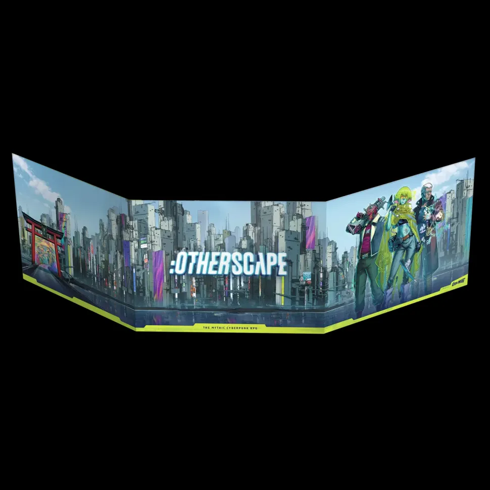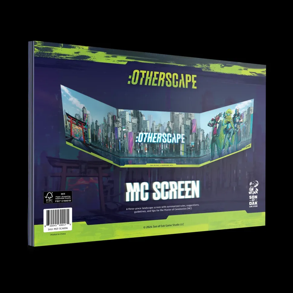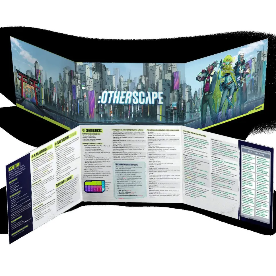 This three-panel landscape illustrated MC (GM) screen, featuring signature:Otherscapeart and characters, contains useful rules summaries, suggested conditions (status) lists, and handy ideas for in-game Threats and Consequences.