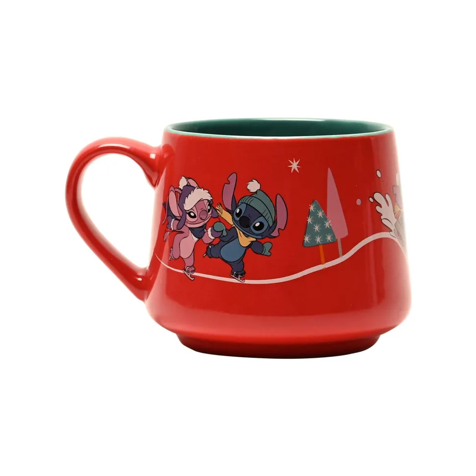 The red ceramic mug showcases a festive design featuring Stitch and Angel from Lilo & Stitch, complete with gloss finish. It is completed by an internal ‘Merry Everything’ title.