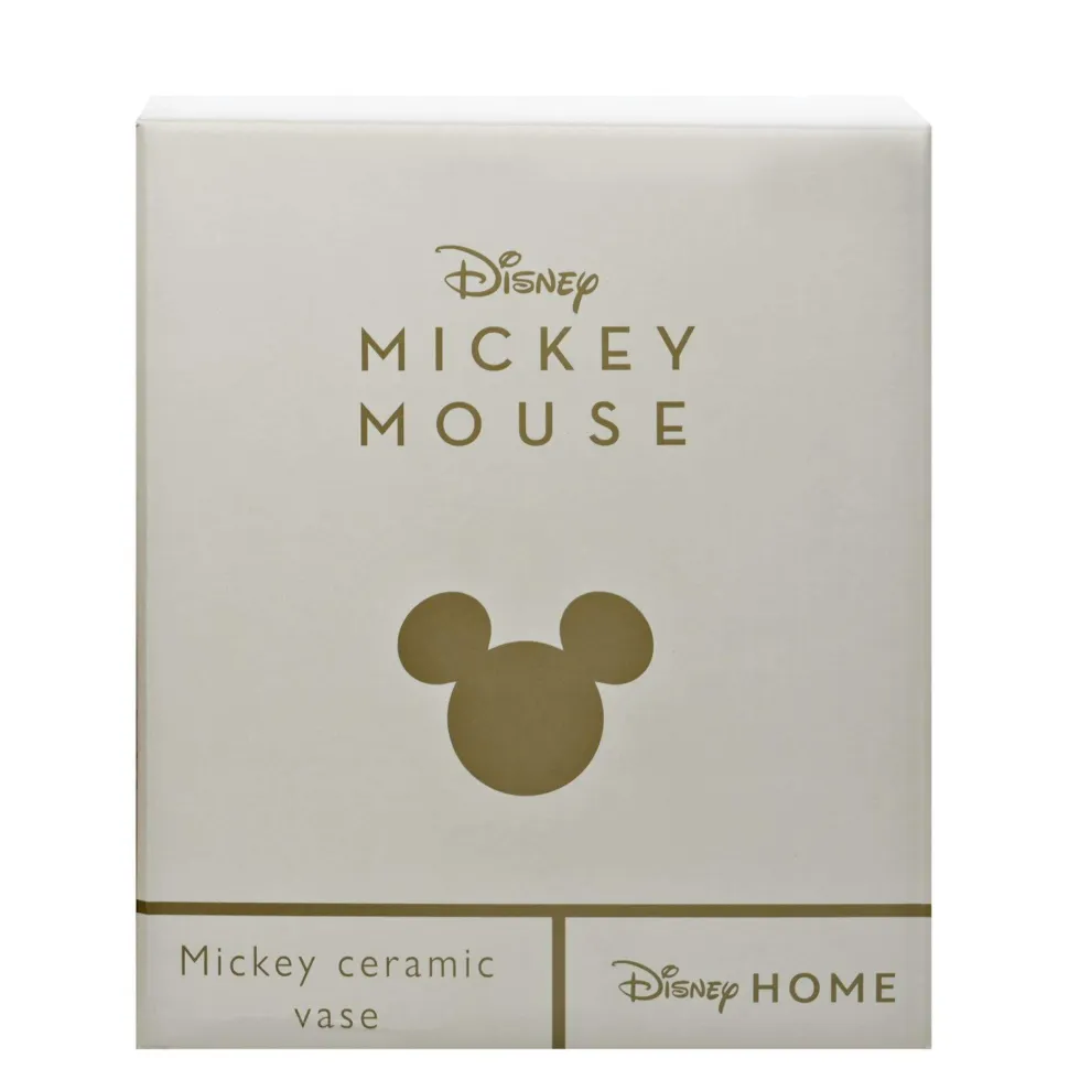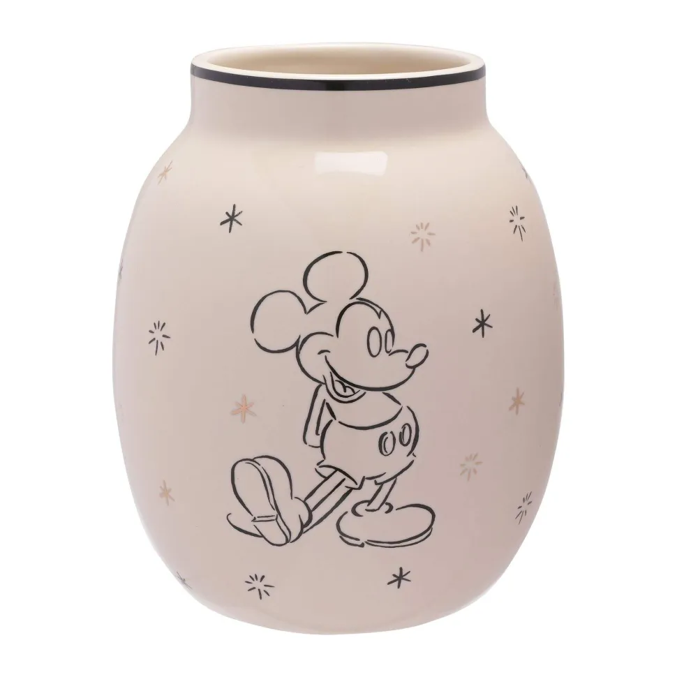 The ceramic vase showcases a printed Mickey Mouse illustration on either side, complete with white colouring and gold foil star decoration. It offers a large opening in which to display beautiful flower arrangements.