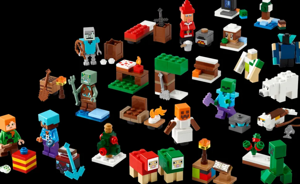 Barn får en koselig og spennende adventstid med 24 luker som alle skjuler en gave. Kalenderen inneholder minifigurer av Alex med smygergenser, Steve med snømanngenser, diamanthjelm og hakke, en smyger ved siden av en busk med søte bær, en druknet med trefork, en omstreifer med diamantrustning, en snøgolem, en zombie med en fortryllet øks og en julenisse-landsbyboer med en ovn. Kalenderen rommer også mange små byggeleker og tilbehør som barn vil kjenne igjen fra det populære spillet. Etter hvert som julaften nærmer seg, får barn stadig flere gaver som kan settes sammen til en Minecraft-vinterlandsby i miniatyr, hvor de kan finne på fantasifulle eventyr. En utbrettbar lekematte danner den perfekte kulisse for fortellingene.