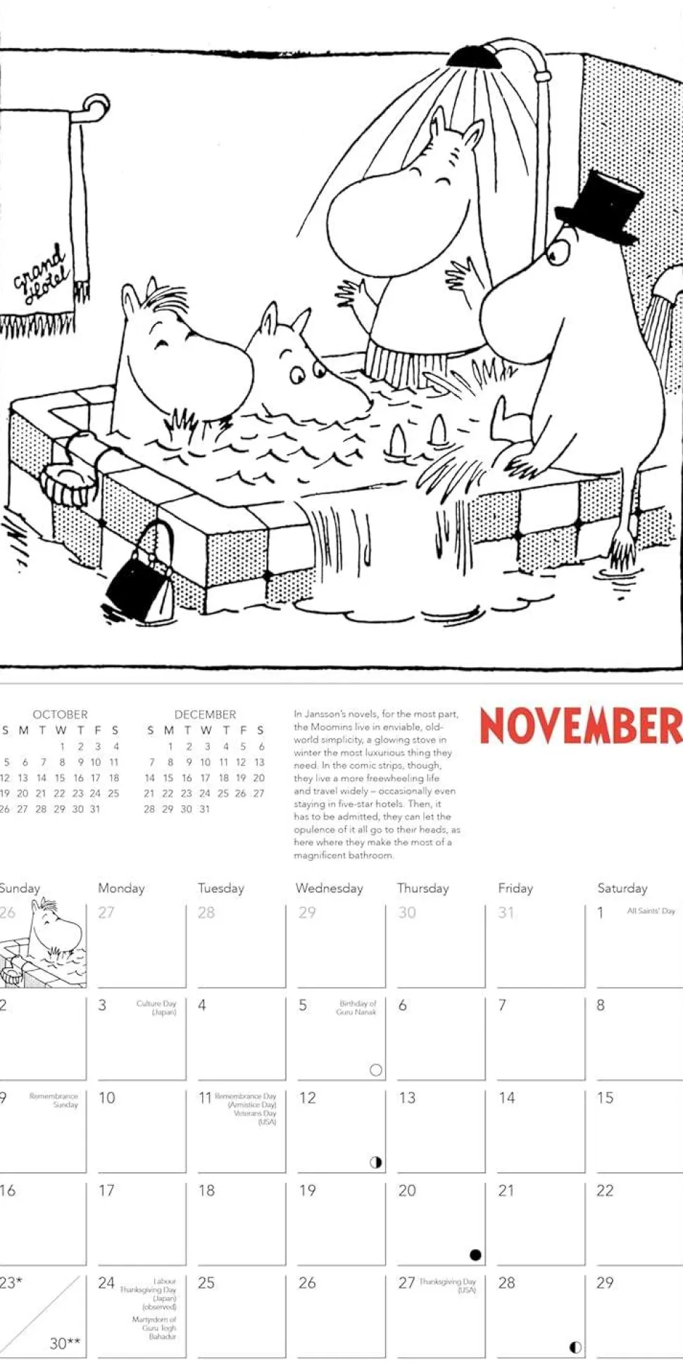 Eccentric, adventurous and kind-hearted, the beloved Moomins, created by Finnish writer and illustrator Tove Jansson, have endeared themselves to audiences since 1945. This mini wall calendar features 12 black-and-white illustrations of the much-loved characters from the comic strip that began in 1947 in the children’s section of the Finnish newspaper Ny Tid. In 1954, London’s biggest evening newspaper, the Evening News, began to publish the Moomin comics too. In this format alone, the Moomins would reach up to 20 million readers in 40 countries around the world. 2025 also marks the 80-year anniversary since the first Moomin story was published. Informative text accompanies each work and the datepad features previous and next month’s views. Printed on FSC-certified paper, with plastic-free packaging.