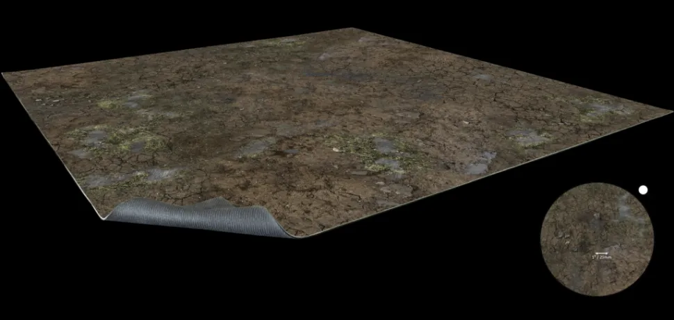 This gaming mat depicts a mud-covered field, also usable as the base for a townscape. It is printed in high quality on fabric with a 1mm neoprene backing. It can be combined with similar mats to make a larger battlefield and can be rolled or folded for easy storage.