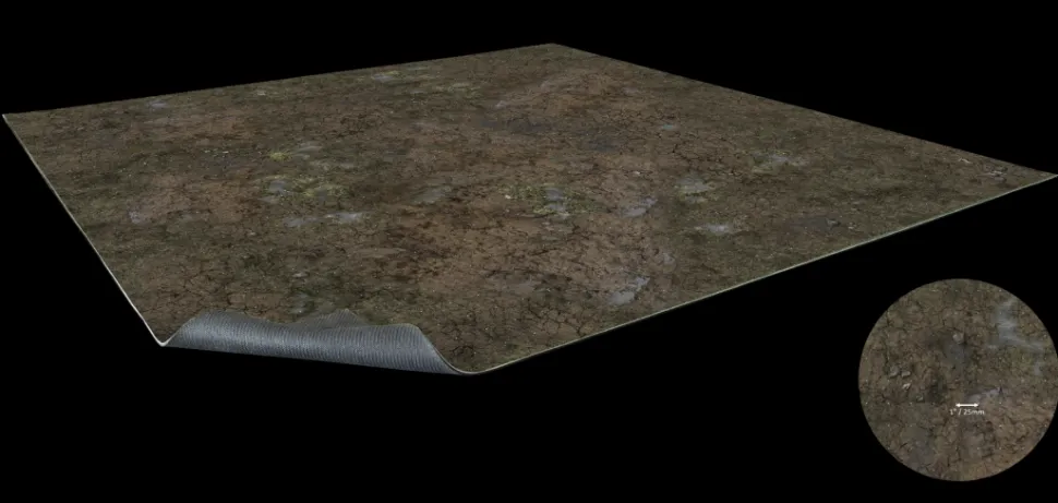 This gaming mat depicts a mud-covered field, also usable as the base for a townscape. It is printed in high quality on fabric with a 1mm neoprene backing. It can be combined with similar mats to make a larger battlefield and can be rolled or folded for easy storage.