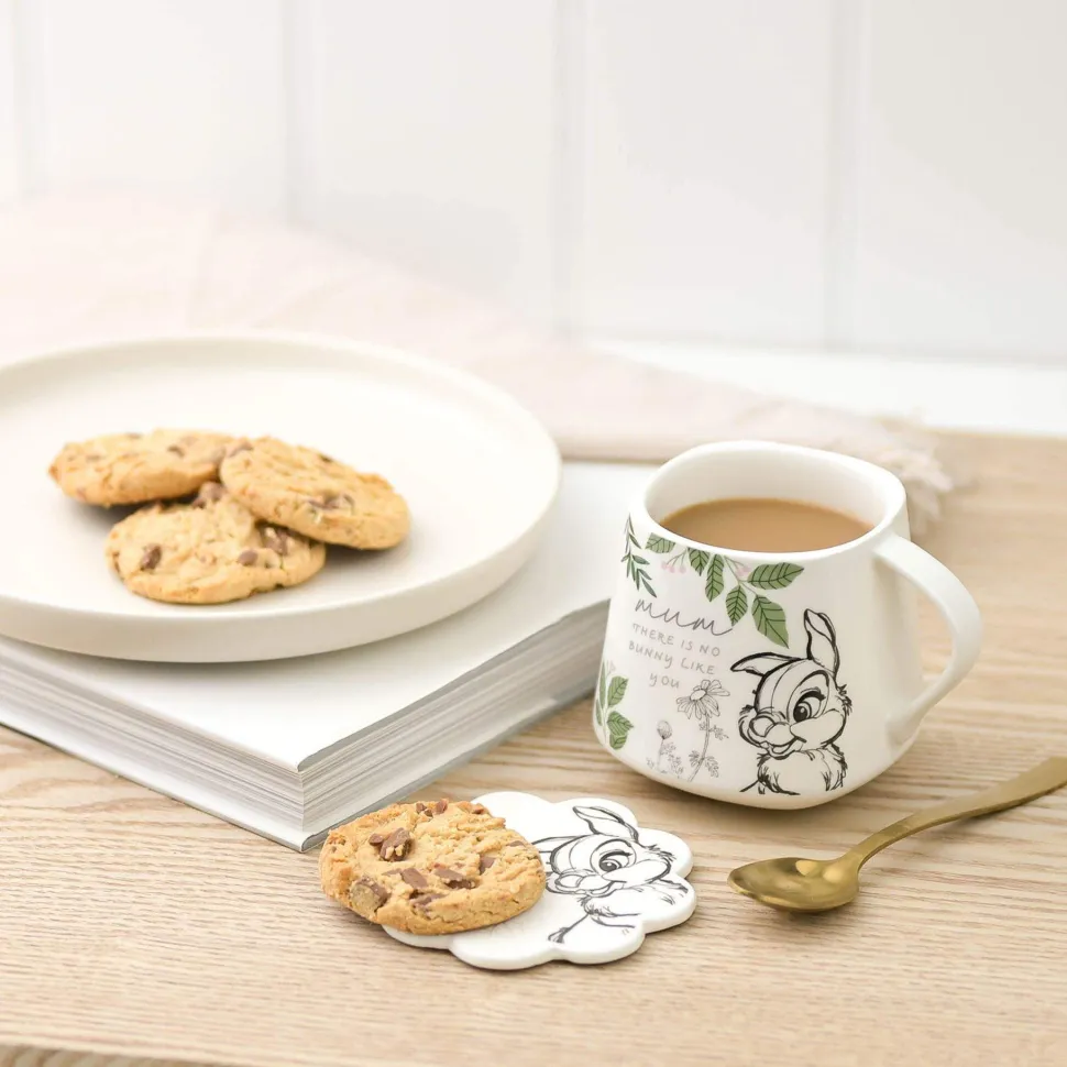 The ceramic mug features a gloss white finish, complete with a printed image of Thumper from Bambi, alongside its ‘Mum – There Is No Bunny Like You’ title, all of which is repeated on both sides. It is paired with a matching coaster which is further by foliage engravings.