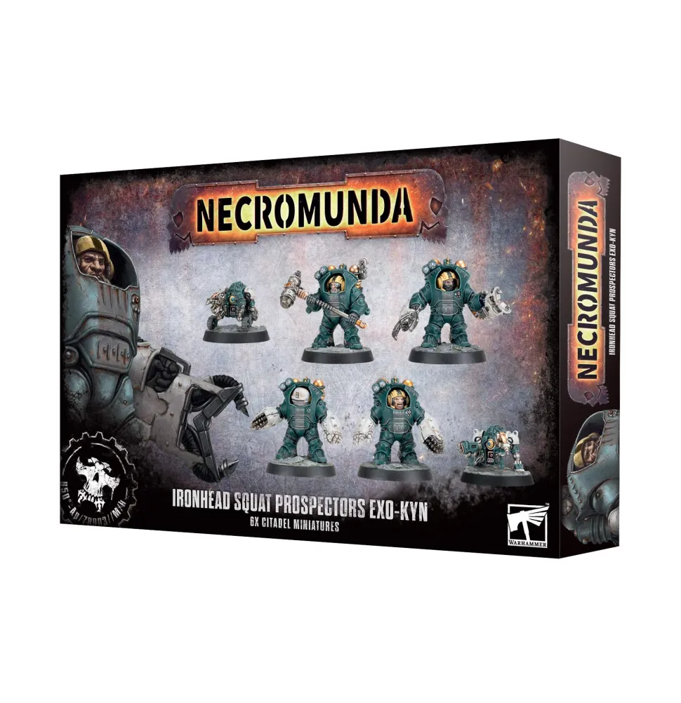 This multipart plastic kit builds four Exo-kyn, which can also be used as Exo Masters, and two Techmite Exovator 078b miniatures for use in Ironhead Squat Prospector gangs in games of Necromunda.