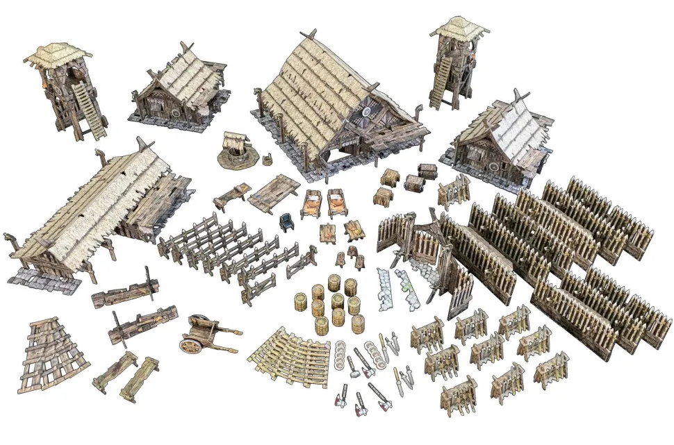 This box contains all the terrain you need for a complete gaming table set in a wooden settlement out on the plains, suitable for many 28-35mm fantasy and historical games. You can build a tightly packed settlement on a small skirmish board or spread the pieces out over a larger table. Many of the pieces are modular and can be assembled in any combination you choose for a different set-up every time. The roofs are removable and the buildings have fully detailed interiors.