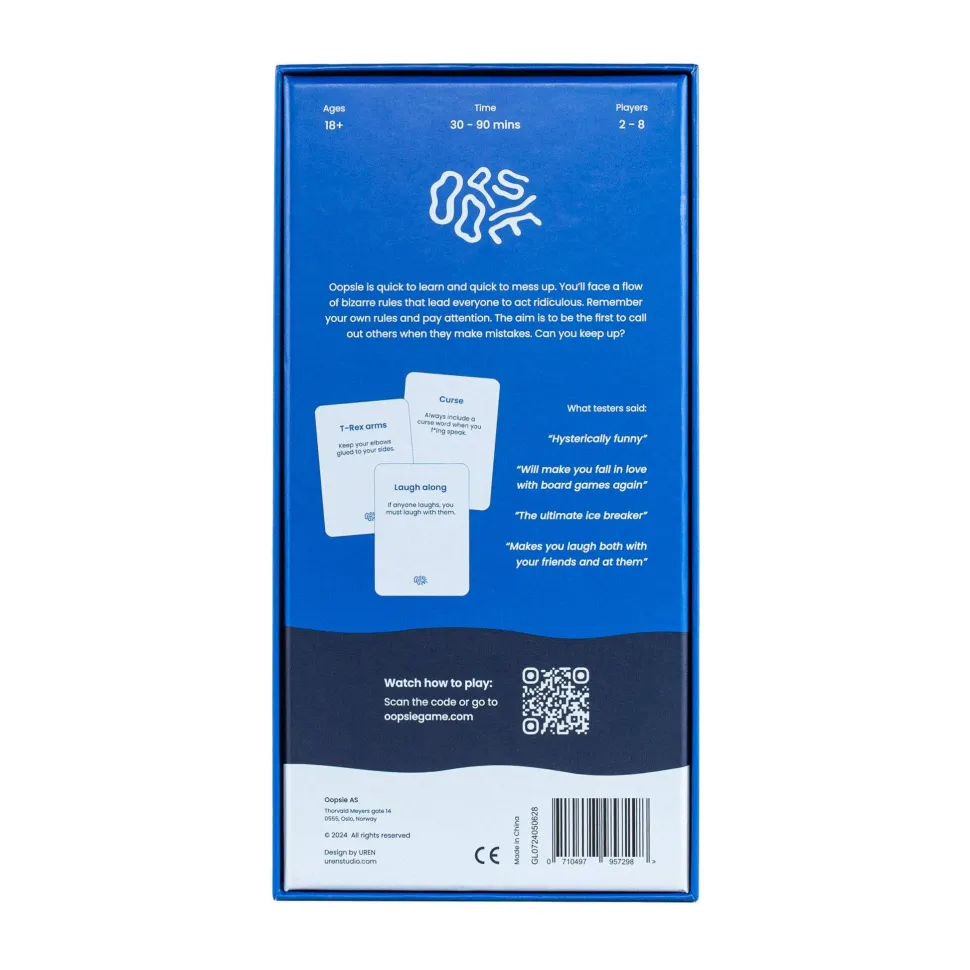 Oopsie er lett å lære, og lett å rote til. Dere møter en haug av absurde regler som får alle til å oppføre seg helt sprøtt. Husk dine egne regler og følg nøye med. Målet er å være den første til å avsløre andres feil! Henger du med?
