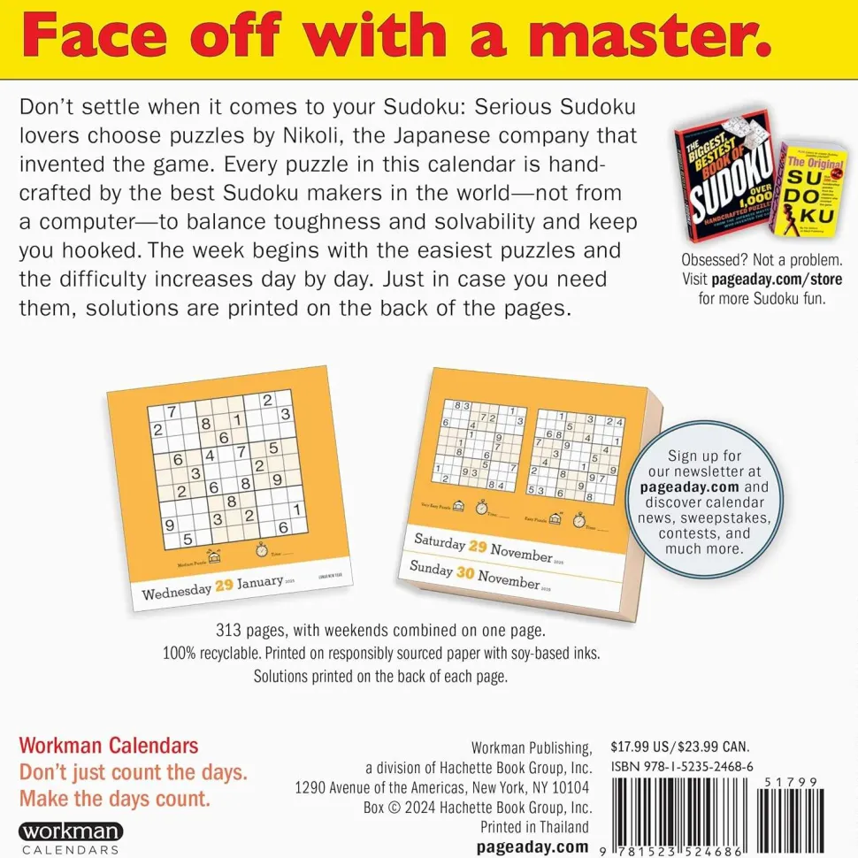 Face off with a master. Don’t settle when it comes to your Sudoku: Serious Sudoku lovers choose puzzles hand-crafted by Nikoli, the Japanese company that invented the game. Every puzzle in this calendar is hand-crafted by the best Sudoku makers in the world―not from a computer―to balance toughness and solvability and keep you hooked. The week begins with the easiest puzzles and the difficulty increases day by day. Just in case you need them, solutions are printed on the back of the pages.?Printed on responsibly sourced paper and 100% recyclable.